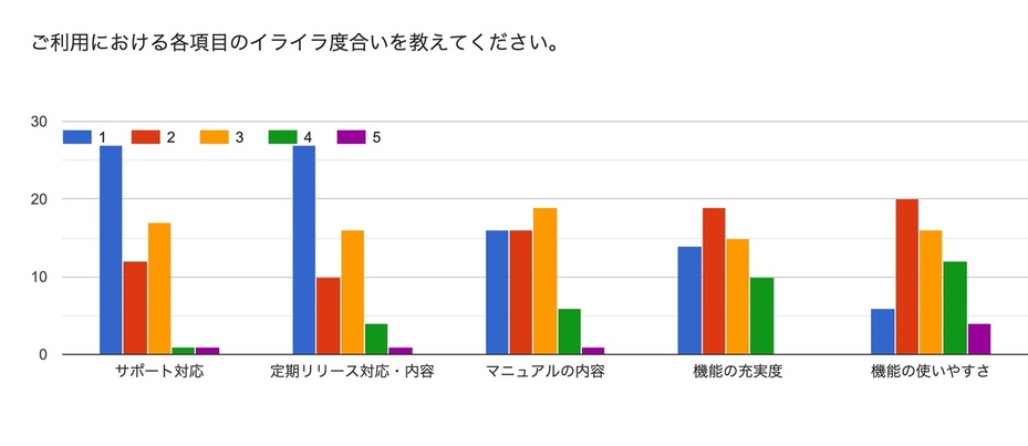使用する上で不便さがイライラに繋がる理由が多い結果となりました。また、バグについてのご意見も社内で共有致します。