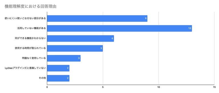 Lycheeの機能が多岐に渡り、かつ業務運用内で活用しない機能があるため理解度が低い傾向があると考えられます。