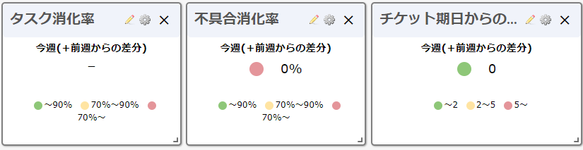 • 指標パネルを並べる: 先週との比較や、赤黄緑などは不要の場合もある ・・・ 複数の指標値を報告するのに適しているかは疑問(指標値パネルを複数並べるのがよいかは疑問)