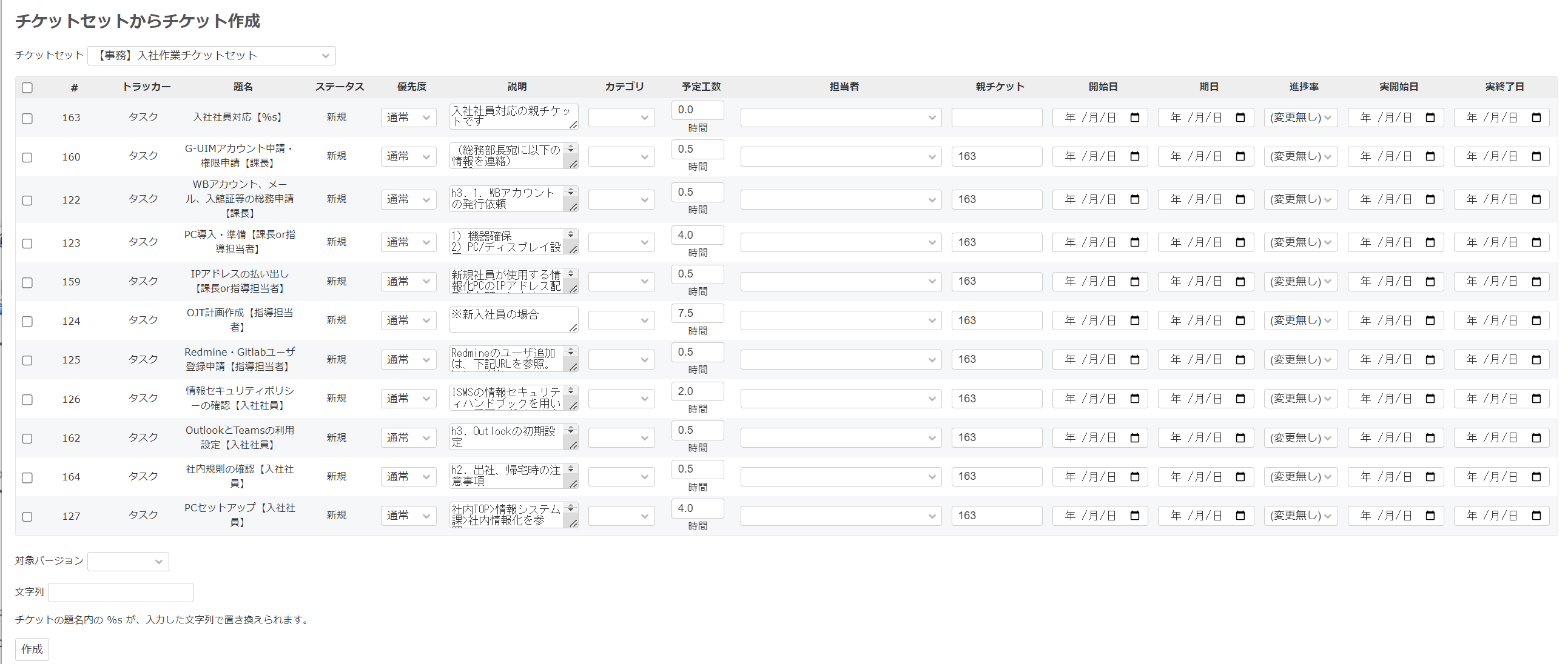 ※当社では、社員入社時の作業を、以下のようなチケットセットにしています。