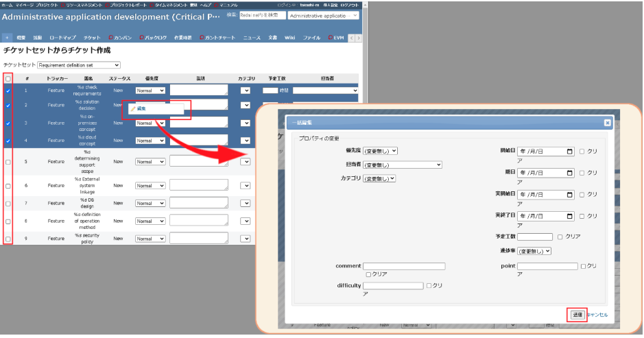 一括で編集したいチケットをチェックボックスで選択し、右クリックしてコンテキストメニューの「編集」をクリックすると一括編集ダイアログが表示されます。