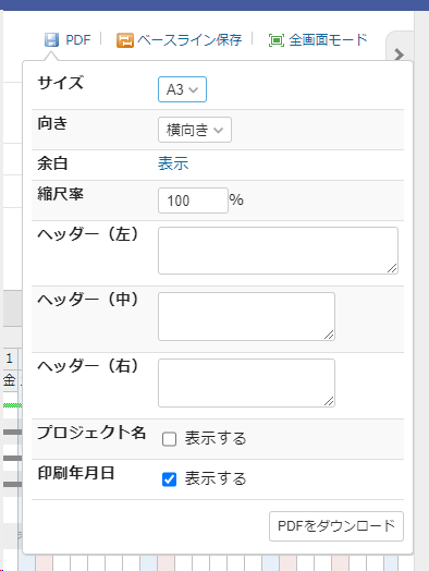 (PDF保存を頻繁に行う機会があり、毎回サイズをA4からA3にしていたり「プロジェクト名:表示する」が不要でチェックをはずしている。)