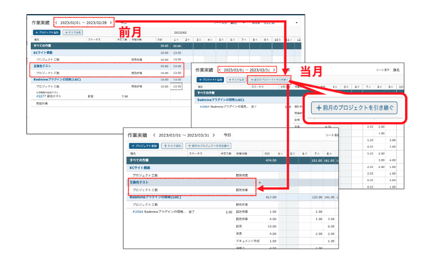 「前月のプロジェクトを引き継ぐ」を押して、前月のプロジェクトを引き継いでも、