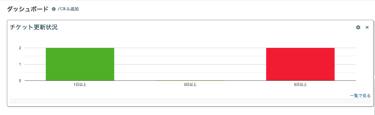 Lycheeダッシュボードをご利用いただくことで、チケットの最終更新日からの経過日数ごとのチケット数を棒グラフで表示させることが可能でございます。
